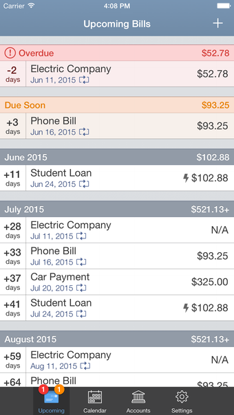 BillTracker Lite的一项突出功能是即将到期的屏幕,清晰地显示所有即将到期的账单及其到期日期。这使得用户可以轻松跟踪下一个需要付款的账单,确保没有任何付款被忽视或遗忘。
